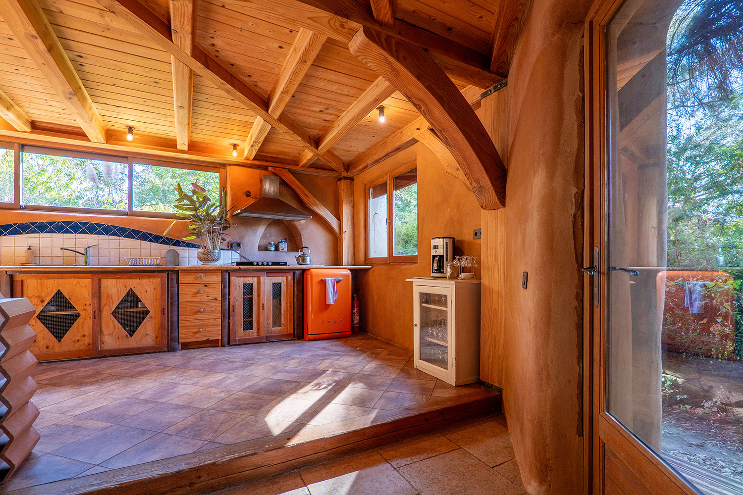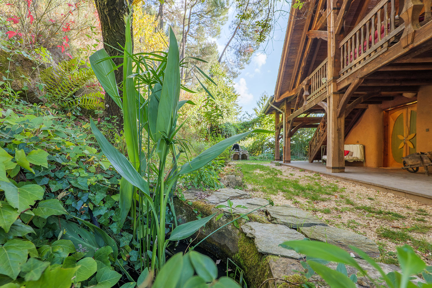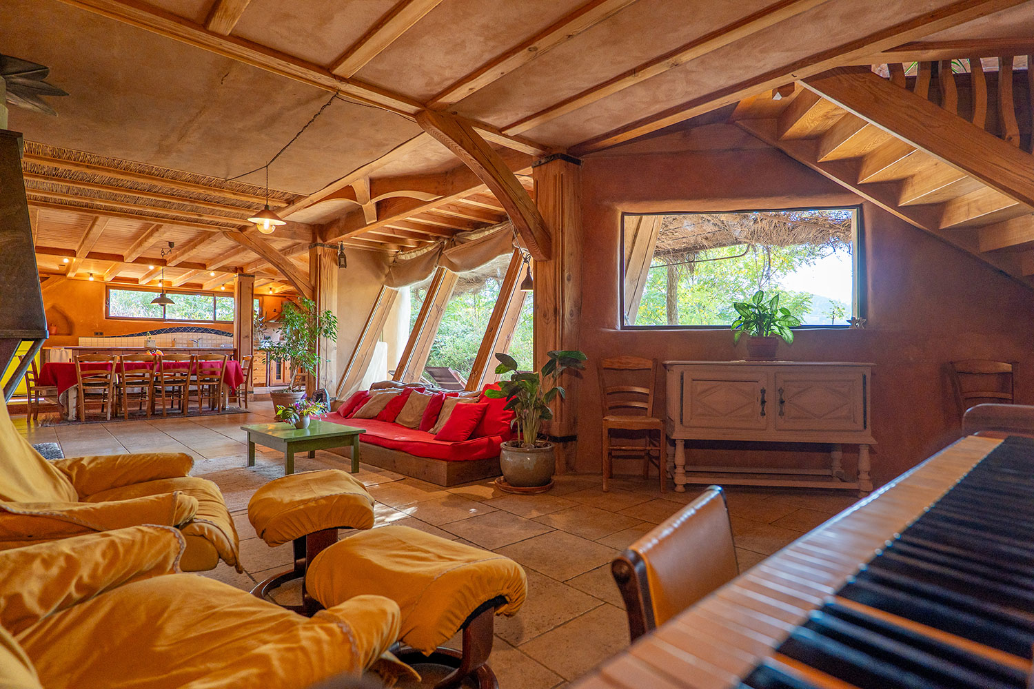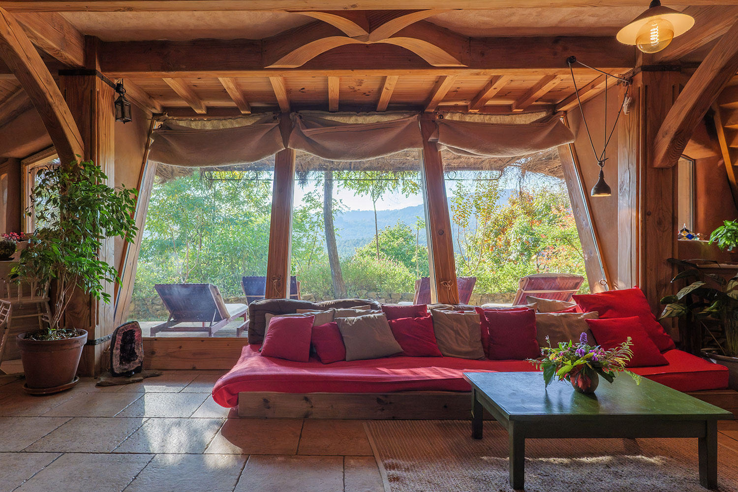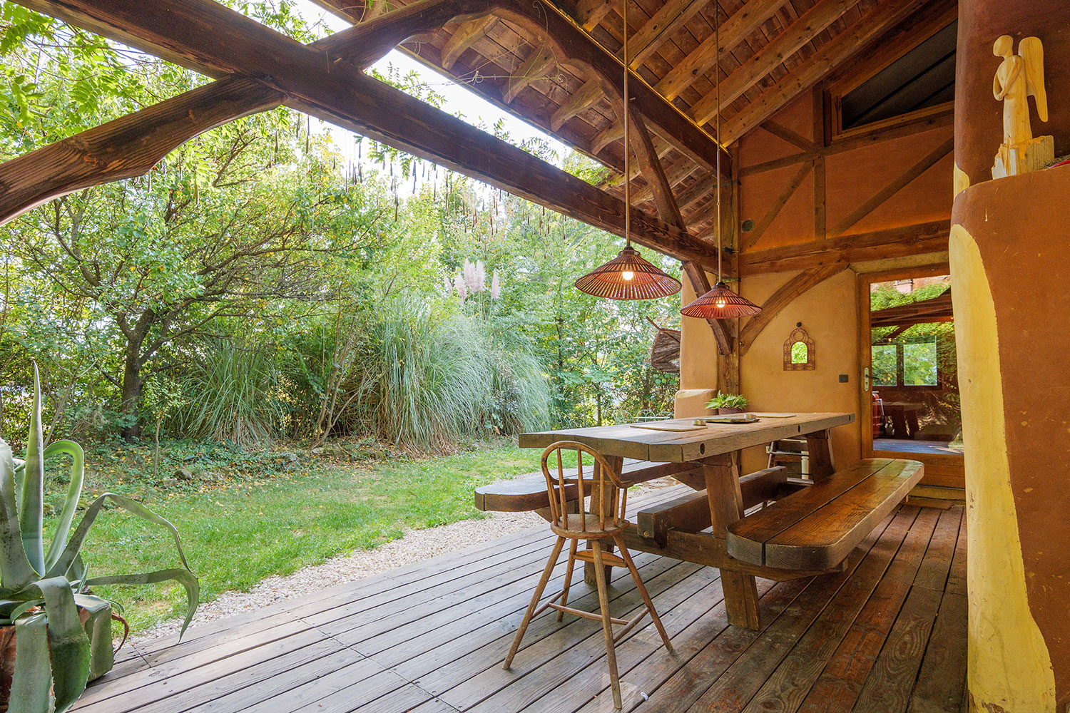Un choix rigoureux des matières et des matériaux, de leur provenance, un lieu où rien n’est laissé au hasard : ossature en bois massif sculpté, murs en paille, enduits en terre, un habitat protégé des ondes, literie naturelle en laine de mouton et coton bio, oreillers en balle d’épeautre, équipement ménager sain et performant, puits canadien pour une ventilation tempérée, récupération des eaux pluviales, chaudière à granulés bois, tri sélectif…